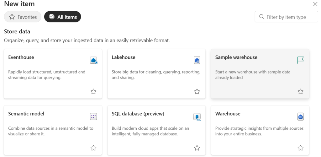 To showcase the spatial functionalities in Fabric Data Warehouse, we will use the sample data warehouse in Fabric. A sample warehouse enables you to quickly start with you warehouse experinece by providing a data sample that you can query immediatelly without a need to load your data.