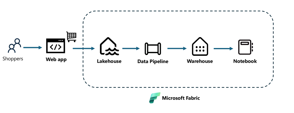 For instance, consider this simplified data architecture where the web application on the left generates user activity data. Your unstructured data will flow from a Lakehouse into a structured Warehouse and can interact with Pipelines or Notebooks along the way.