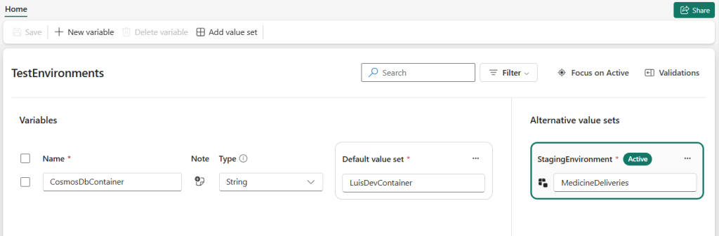 Once the functions are ready, activate the alternative value set with staging, more serious, environment called MedicineDeliveries. This approach is useful because there is no need to make any code changes to switch environments. This is a code sample of how to read those values: