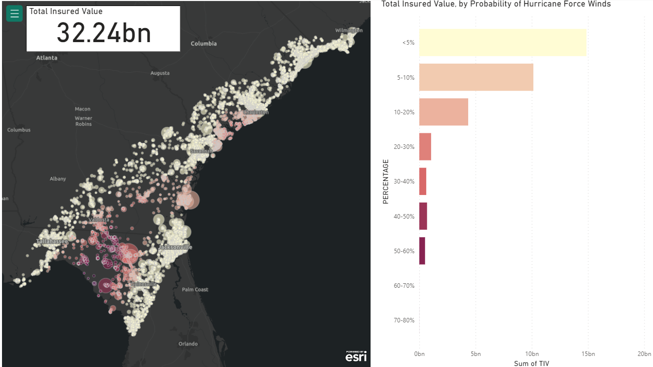 Here is an example of Total Insured Value by probability of hurricane force winds for the given geographical area: