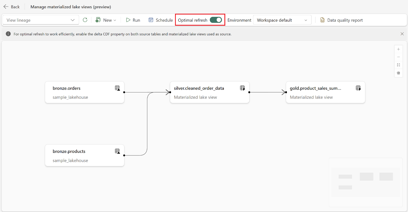 This feature enhances refresh performance by determining the most effective refresh strategy (incremental, full, or no refresh) for your Materialized lake views.