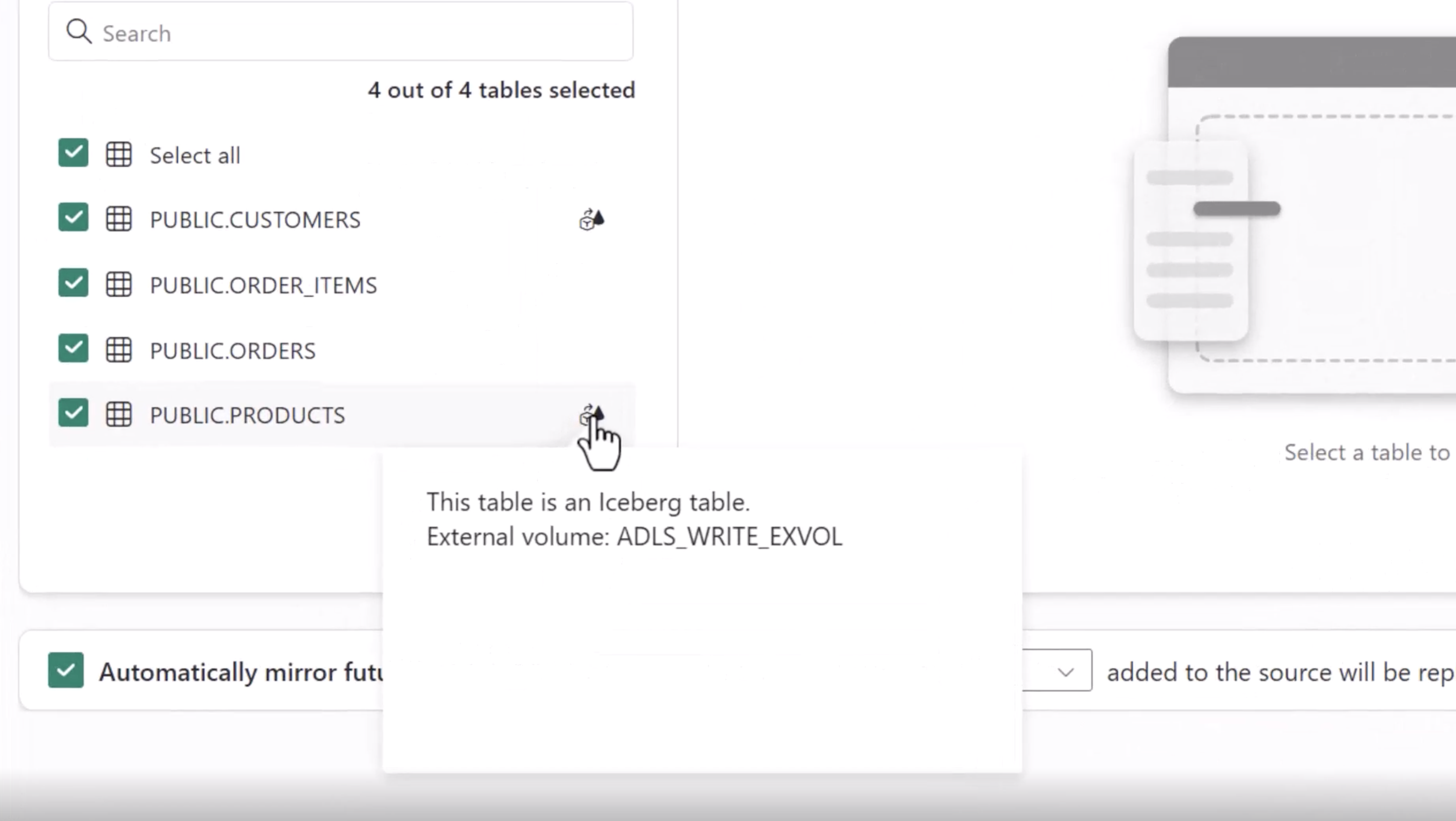 During setup, Fabric automatically detects and distinguishes between managed and Iceberg tables, giving users the flexibility to mirror future tables as they’re created. For Iceberg tables, which reside in customer-owned storage, Fabric allows you to select your preferred storage provider, ensuring secure and direct connectivity to your data.