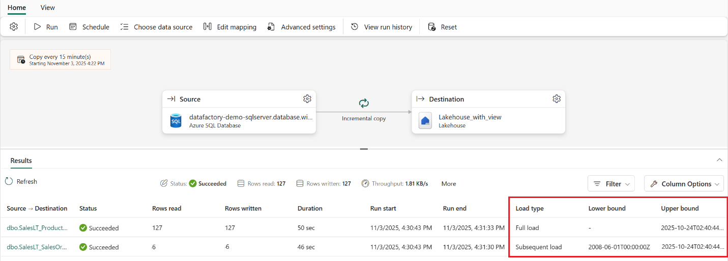 What’s more, the monitoring experience of Copy job has been enhanced: you can now access more detailed statistics for each run, including watermark values, load type, and row counts for inserts, updates, and deletions, giving you full visibility over your Copy job.