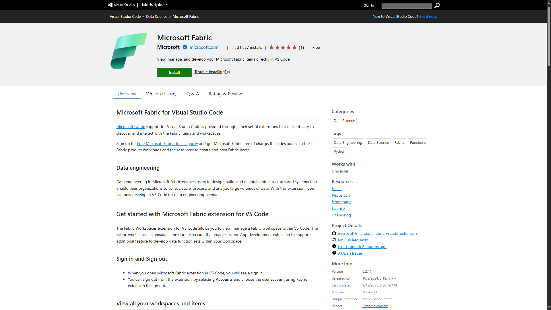 Figure: Microsoft Fabric extension for VS Code in extension marketplace