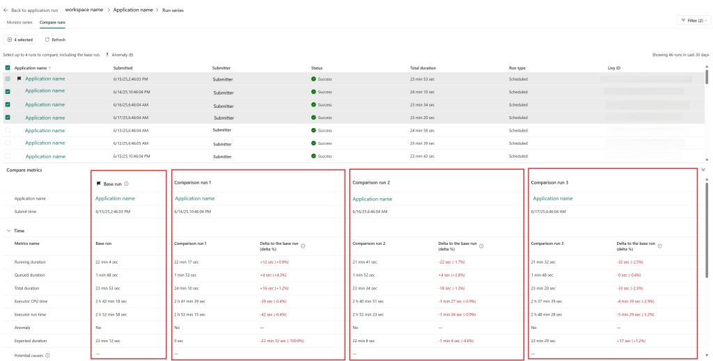 • Compare runs from the same artifact (e.g., Notebook or Spark Job Definition).