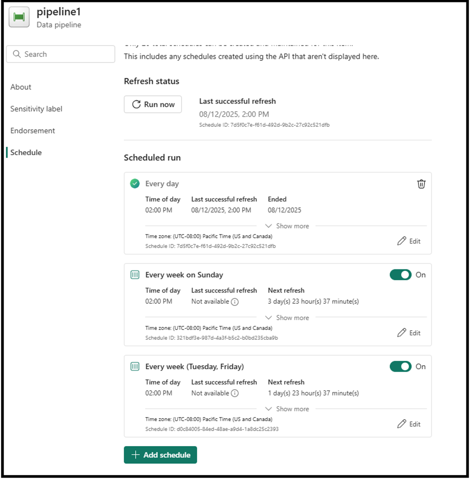 Pipeline monitoring is enhanced, as pipelines now support workspace monitoring, providing real-time insights into performance and reliability. Additionally, you can now assign multiple schedules to a single pipeline, giving you unprecedented flexibility in how and when your pipelines run. These features work in concert to deliver a robust, secure, and agile automation environment where your data strategies can thrive.