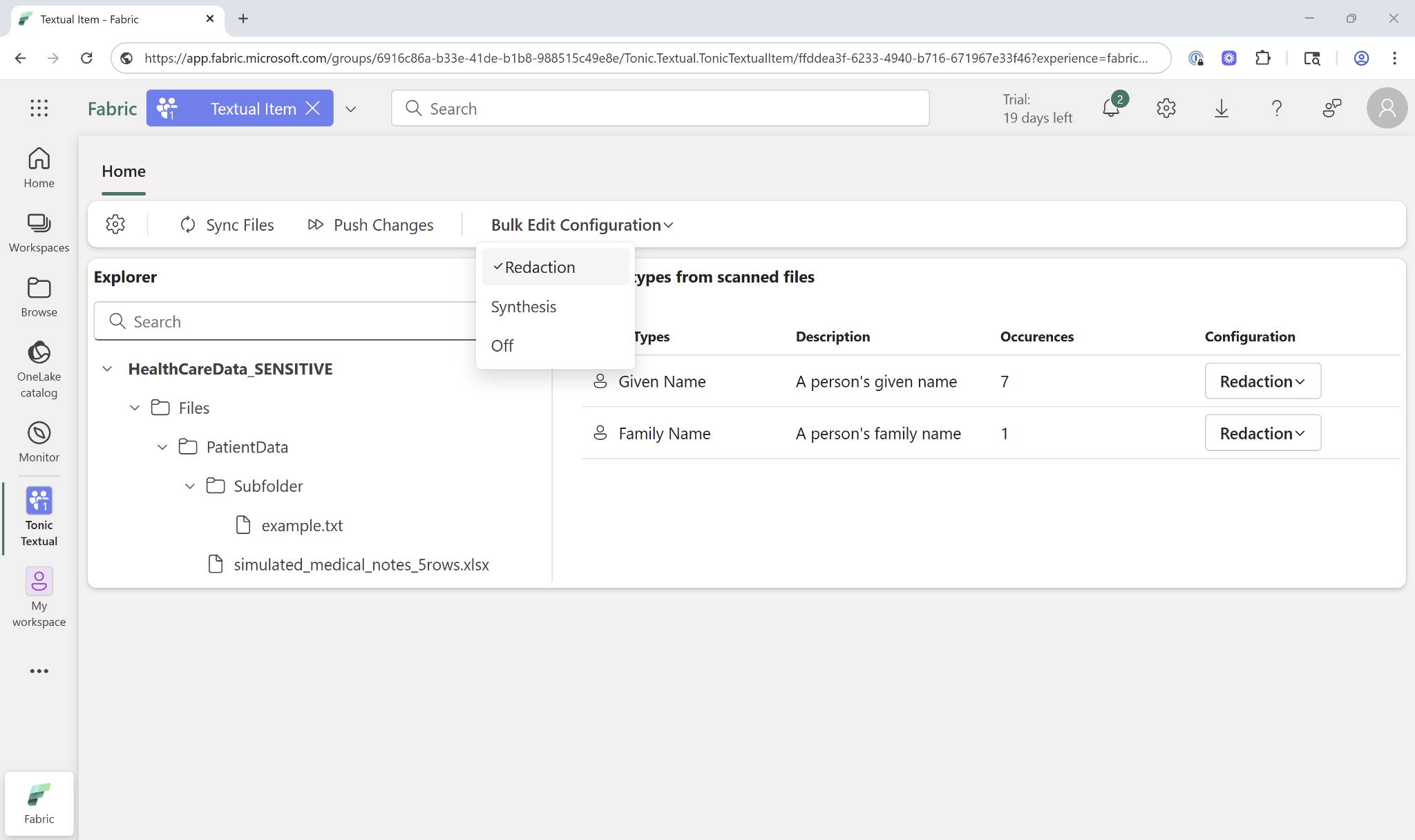 With Tonic Textual integrated into the Fabric user experience, teams can prepare office documents, PDFs and images containing sensitive text for AI and machine learning tasks—all while protecting privacy and maintaining compliance with regulations such as HIPAA and GDPR.