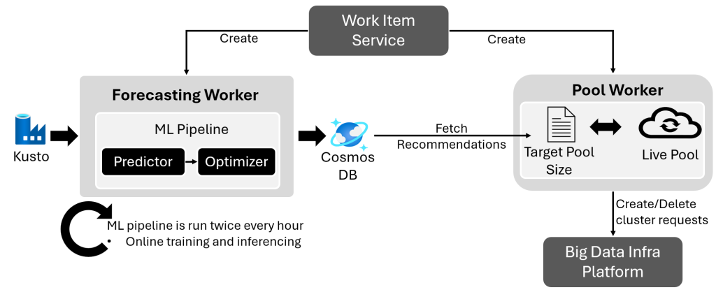 • Production architecture- Recommendations are stored centrally and read by a Pool Worker that calls our Big Data Infra Platform Services (orchestrates jobs/sessions and provisions and stitches VMs) to create/delete starter pool instances. Telemetry flows into the predictor; a simple hyper-parameter tuning loop runs less frequently to keep the cost – experience trade-off healthy.