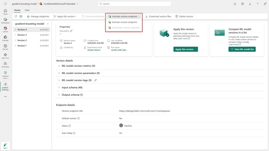 You can activate real-time endpoints for an ML model version with a single call to our REST API or a single click in the Fabric interface.