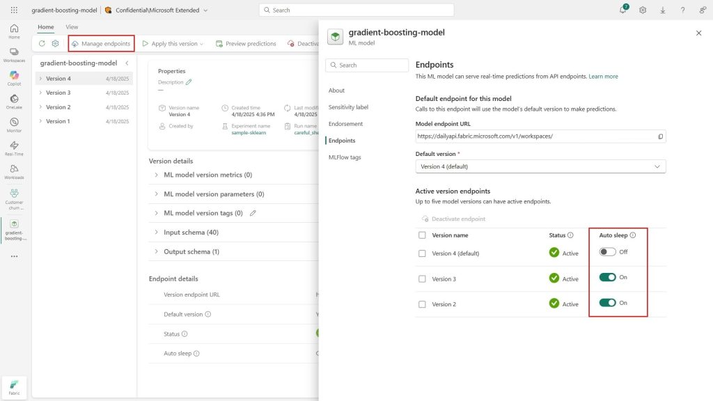 The settings for your ML model now include endpoint properties, including a user-configurable default version and an auto-sleep toggle for each active version.