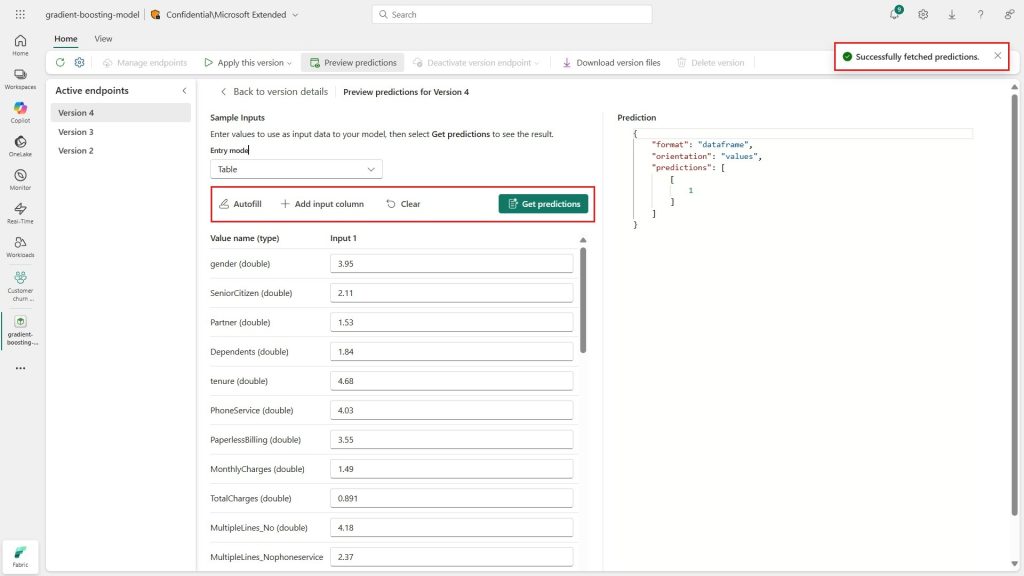 Before serving predictions to other Fabric experiences or custom applications, you can preview sample predictions without leaving the product. A low-code interface enables instant testing, letting you key in requests with form fields or a JSON editor and examine responses in real time.
