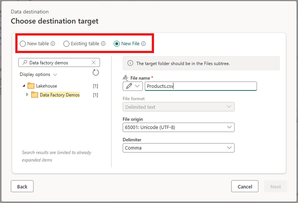 • Fabric Lakehouse Files (CSV): We are introducing the ability to write directly to CSV files into your Lakehouse for further processing. This is a game-changer for teams working with Spark, Python, or other open-source tools. Simply use the existing Lakehouse connector and switch to new file mode right away when you are choosing your destination target.
